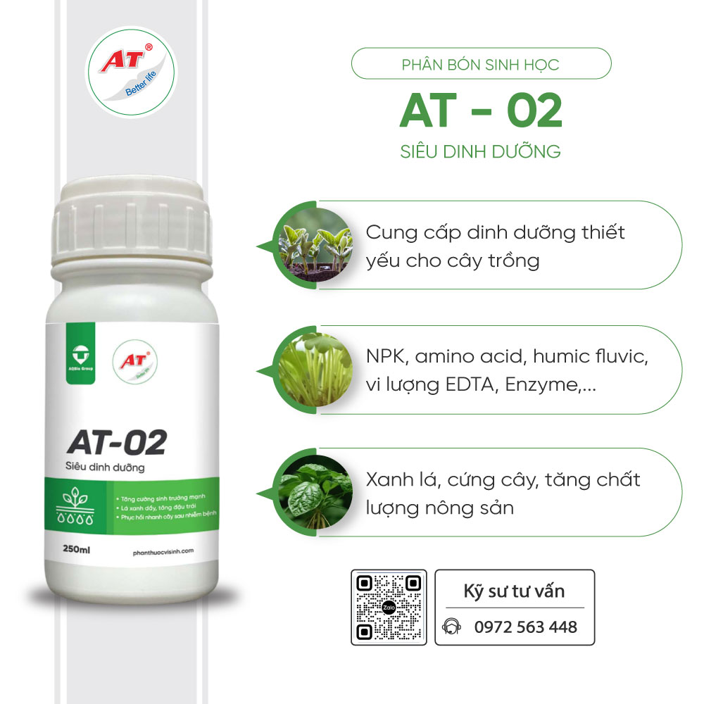 Siêu dưỡng cây AT.02 là dòng sản phẩm sinh học giúp cung cấp dưỡng chất thiết yếu cho sự phát triển của cây. Giúp cây phát triển xanh lá, đứng cây, cho ra nông sản đạt tiêu chuẩn xuất khẩu, mang lại một mùa vụ bội thu cho bà con.